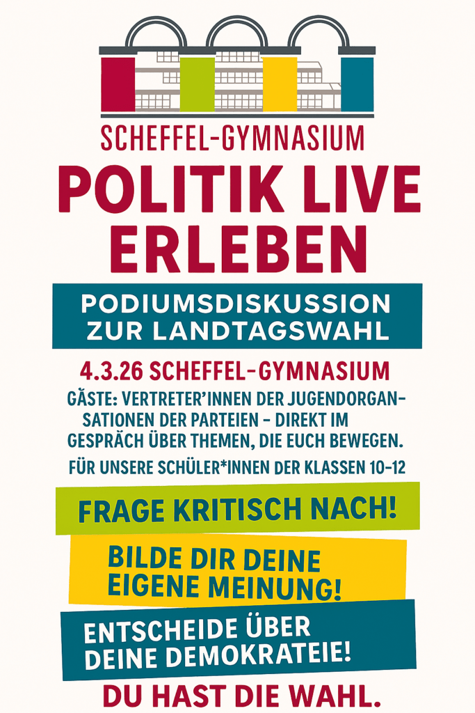 Demokratie lebt davon, dass wir miteinander sprechen, zuhören, Position beziehen und uns einmischen. Der Leistungskurs Gemeinschaftskunde lädt deshalb alle unsere Schüler*innen der Klassen 10, 11 und 12 herzlich zu einer selbst organisierten Podiumsdiskussion ein!Gemeinsam wollen wir zeigen, wie politische Teilhabe aussehen kann – nicht abstrakt, sondern ganz konkret, direkt an unserer Schule.Die Veranstaltung bietet euch die Chance, verschiedene Perspektiven kennenzulernen, kritische Fragen zu stellen, eigene Standpunkte zu reflektieren und Demokratie live zu erleben.Sei dabei – gestalte deine Demokratie! Wir freuen…