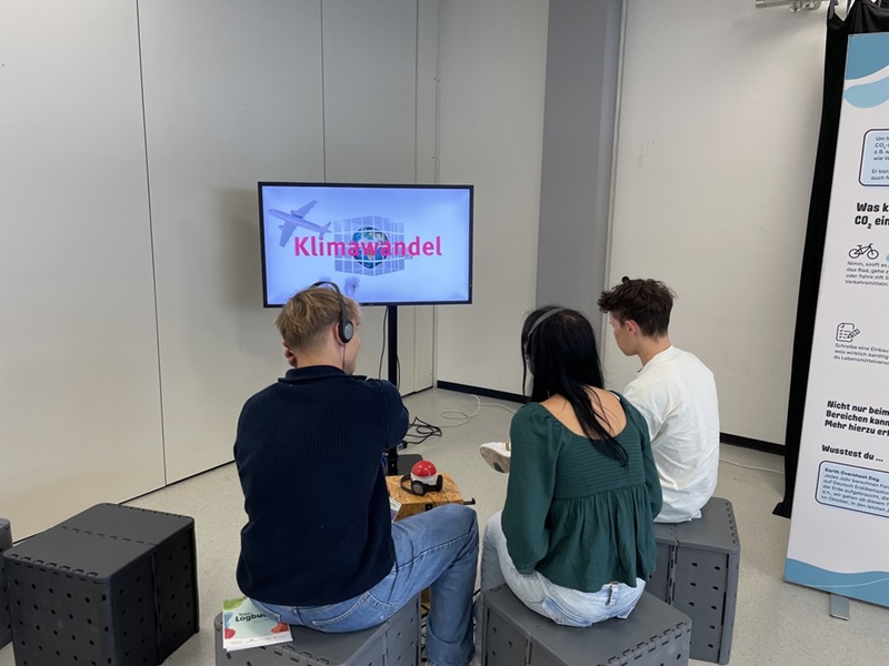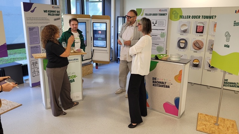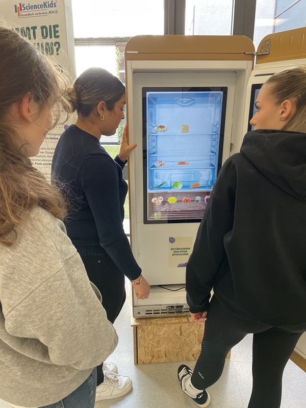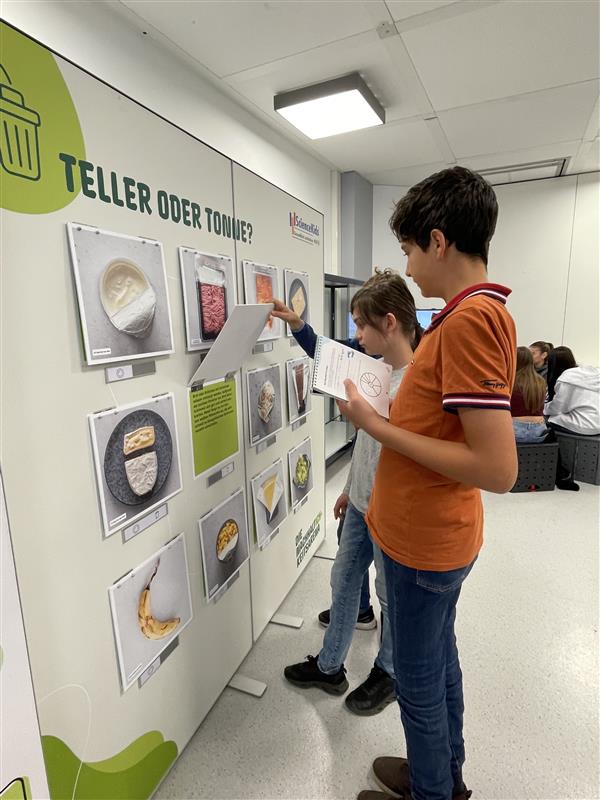 Wie lange hält eigentlich der Lachs im Kühlschrank? Was ist ein Unverpackt-Laden? Woher stammen die Lebensmittel? Wie sieht es mit dem Tierwohl contra CO2-Bilanz aus? Diesen und anderen Fragen konnten die Schüler:innen mit Hilfe Ausstellungsstücken zum Anfassen und Mitmachen oder Aufstellern mit Hintergrundinformationen, aber vor allem auch in Experimenten, Team-Aufgaben, digitalen Spielen und Übungen nachgehen.