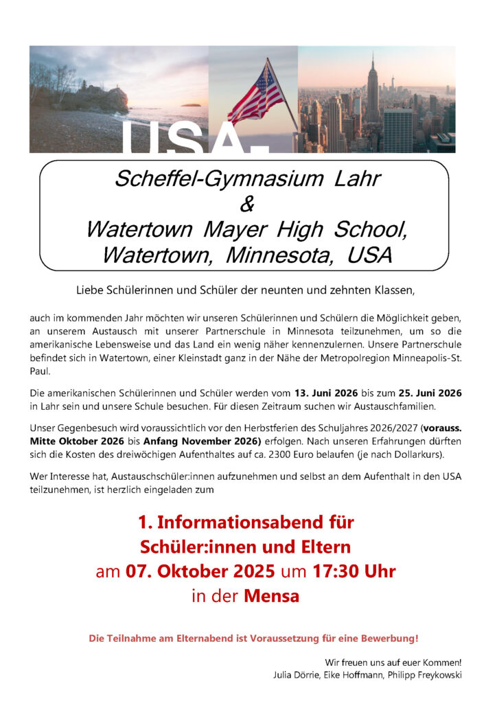 Der USA-Austausch findet alle zwei Jahre im Juni (Amerikaner in Lahr) und Oktober (Lahrer in den USA) statt.